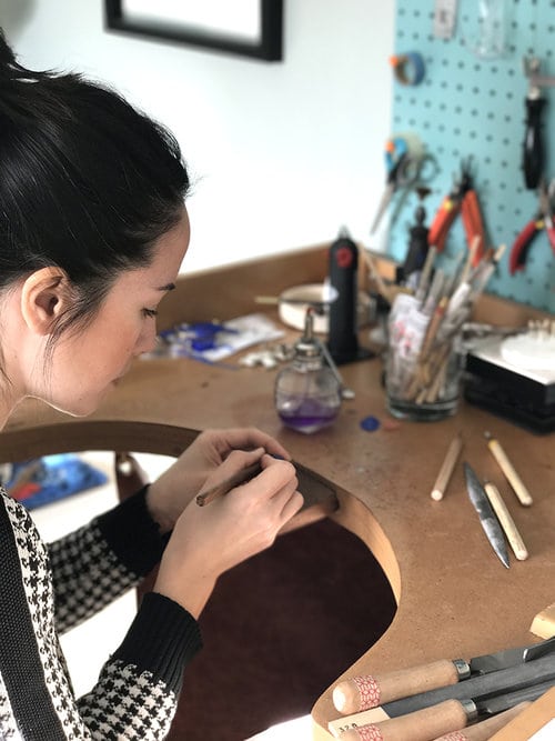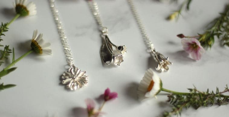 Firstly, Erica from Astrid and Rose who is based in Berkshire, creates the most stunning collections including ‘Wildflowers’, ‘Woodland Wonders’ and ‘Celestial’. Here Erica talks about her inspiration and a little about her process – “one of the processes I fell in love with instantly is the lost wax casting technique, an art form that dates back to ancient times, where a piece is hand carved in jeweller’s wax, and then cast in metal. I make intricate nature inspired charms using this method, working with very fine carving and detailing tools. I am lucky enough to live surrounded by the beautiful English countryside. The abundance of nature and the seasons inspire me, from pretty wildflowers to woodland creatures, I fill my sketchbook with drawings and ideas before embodying them into delicate pieces of jewellery”.