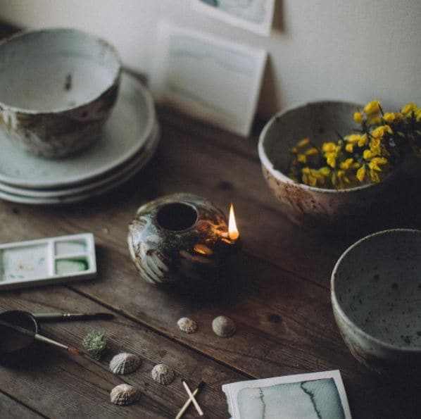 Alex also offers this piece of advice “work out who you are and what your style and vision is. Compromising yourself to make other people happy is always a disaster”. Wise words I’d say…and I think surround yourself with what inspires you. I recently picked up a couple of pheasant feathers I found on the ground, and a large ear of corn which are now displayed in a beautiful piece of pottery that I treasure. It’s actually an oil burner by Chloe Burke of Whinblossom from her ‘Into the Beguilding Wild’ collection that I use to store my finds in. Chloe’s inspiration comes from her home in the Undercliff on the Isle of Wight, one of the largest areas of urban landslip in Europe. “Her practice examines her journey from the Undercliffs to the studio. It embodies the coastline, from its vast minerals to the roll of the shoreline and the changing cliff face”. Again, an example of a talented maker taking inspiration from the wilds of nature. The photo below is courtesy of the fabulous Jeska & Dean at The Future Kept, where some of Chloe’s work is available from.