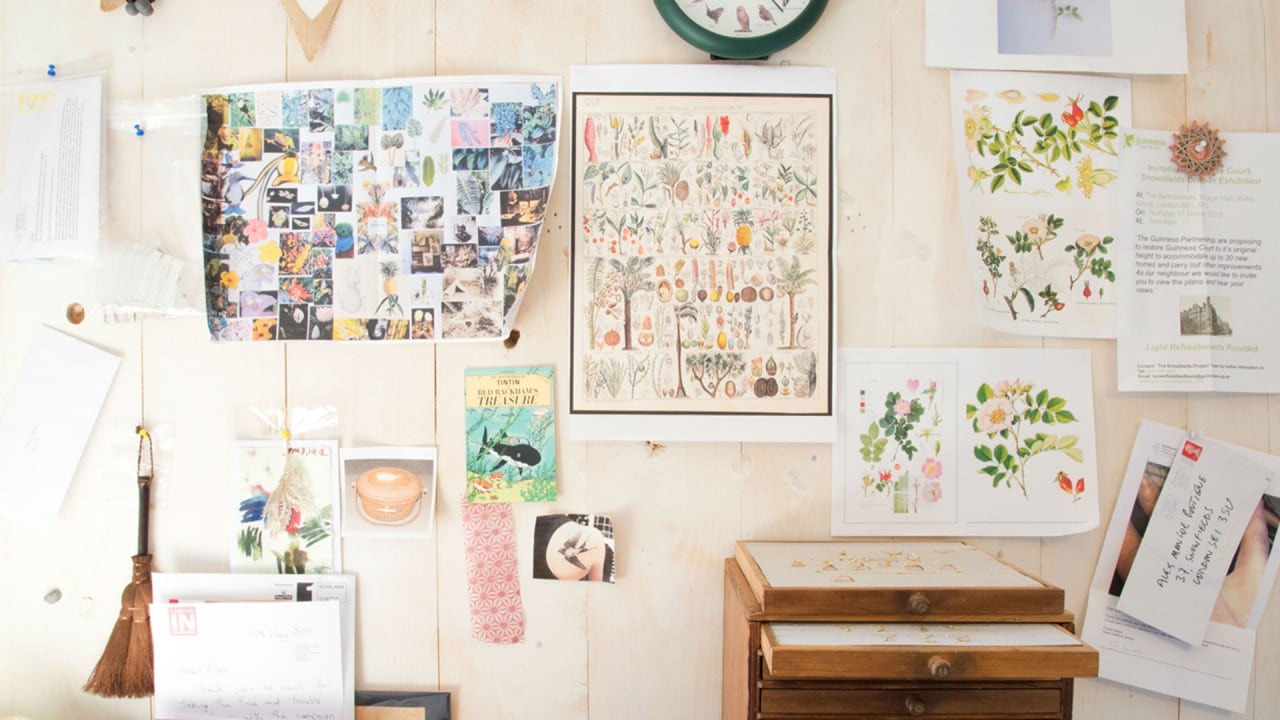 This photo of Alex’s London workshop in London shows some inspirational images and prints on the walls. I have a large noticeboard in my office at home, and I also put up postcards, photos and anything that inspires me, which helps me to define my own style. I too am mostly inspired by nature and take a lot of photos so that I can work with these in my drawing and painting. Botanical drawing is what interests me most, and so I will include images and prints of those artists in that area that inspire me and anything else I can find.